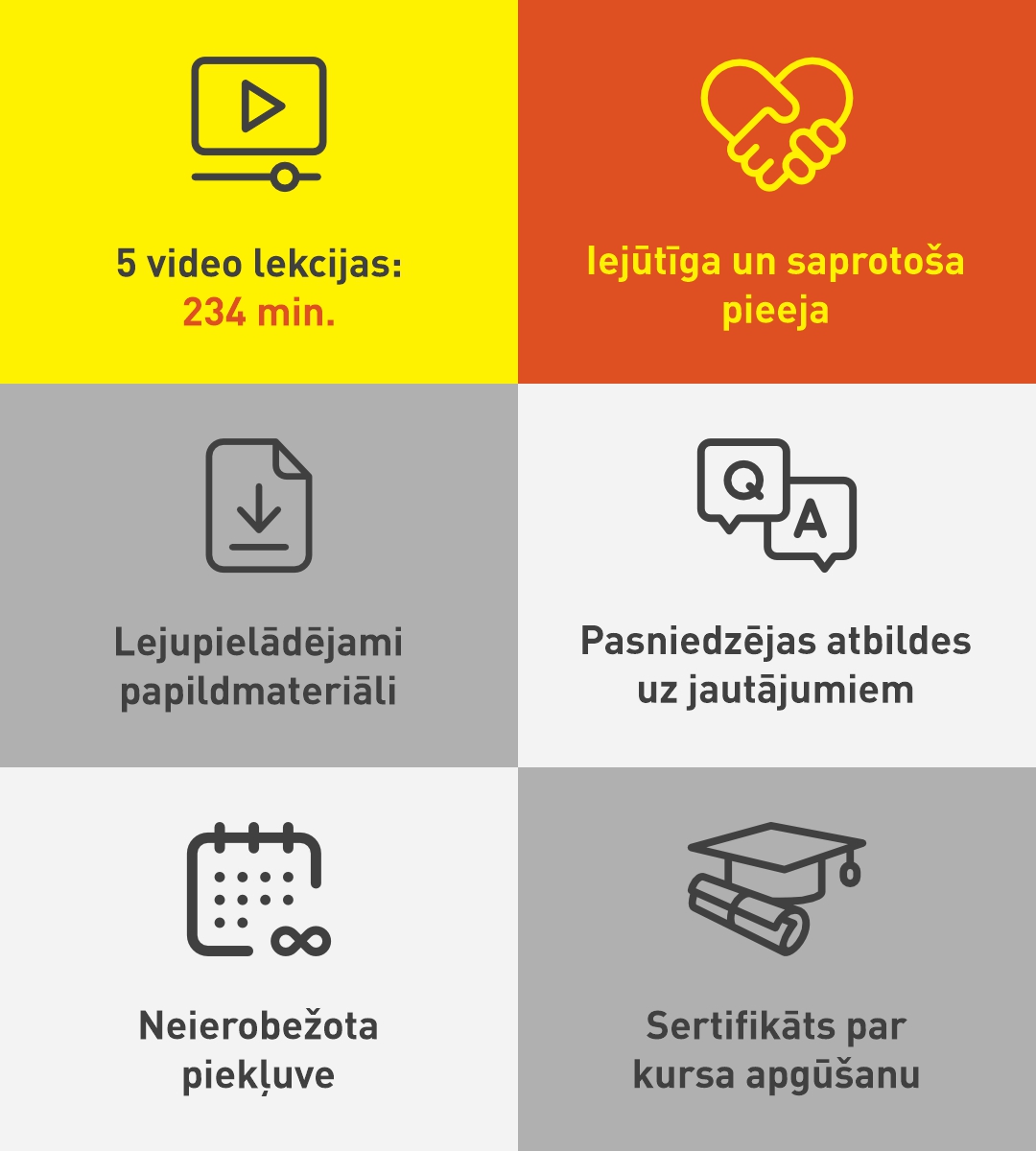 Piekļuvi lekcijām saņemsi uzreiz pēc pirkuma veikšanas. Lekcijas ir skatāmas tiešsaistē (“online”) jebkurā tev ērtā laikā un vietā. Tās nenotiek ne klātienē, ne tiešraidē un nav lejupielādējamas.