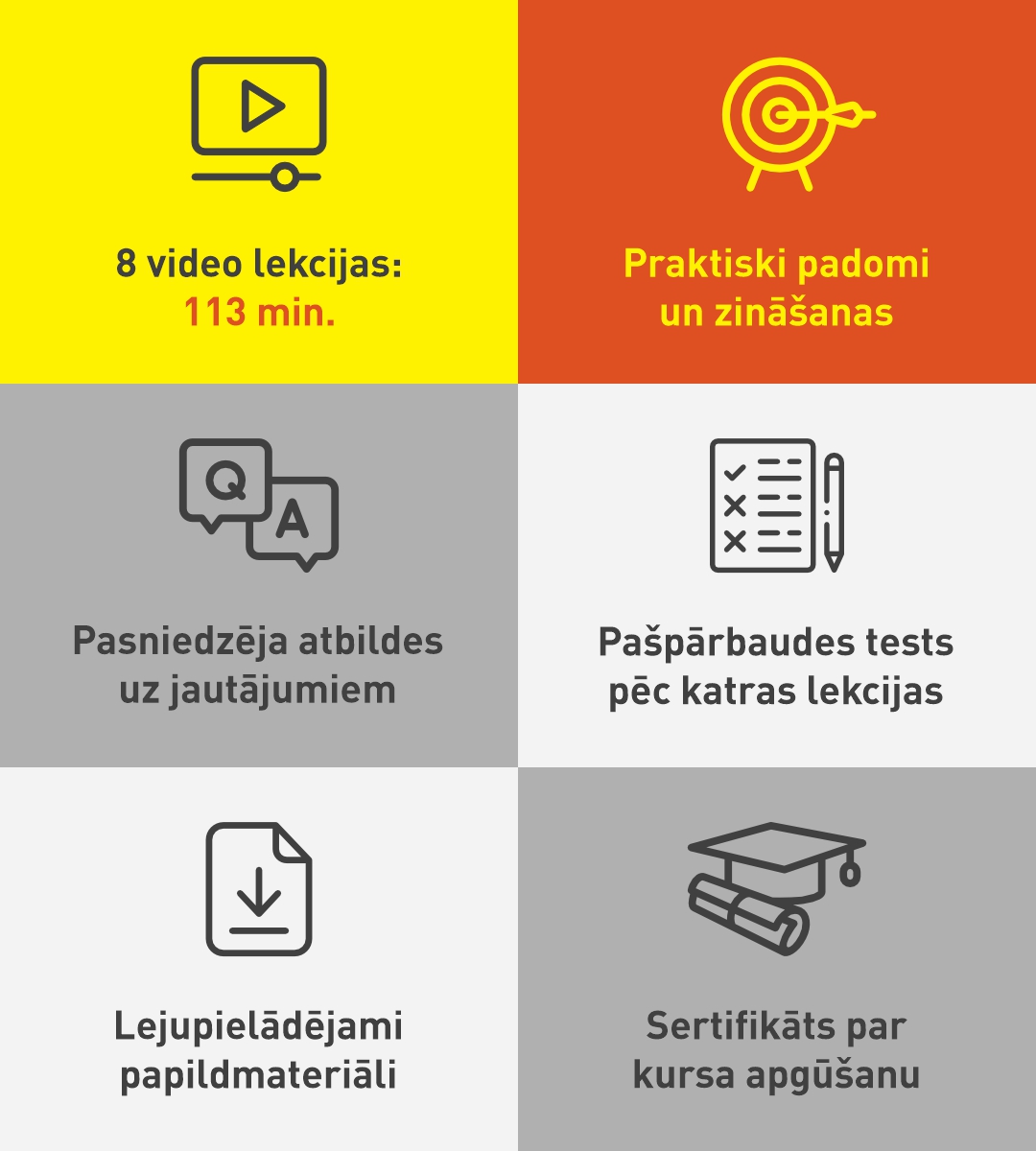 Kursa kopsavilkumā atradīsi lekcijās aplūkoto tēmu galvenās atziņas, pie kurām varēsi ērti un vienkārši atgriezties, kad vien radīsies tāda vajadzība.