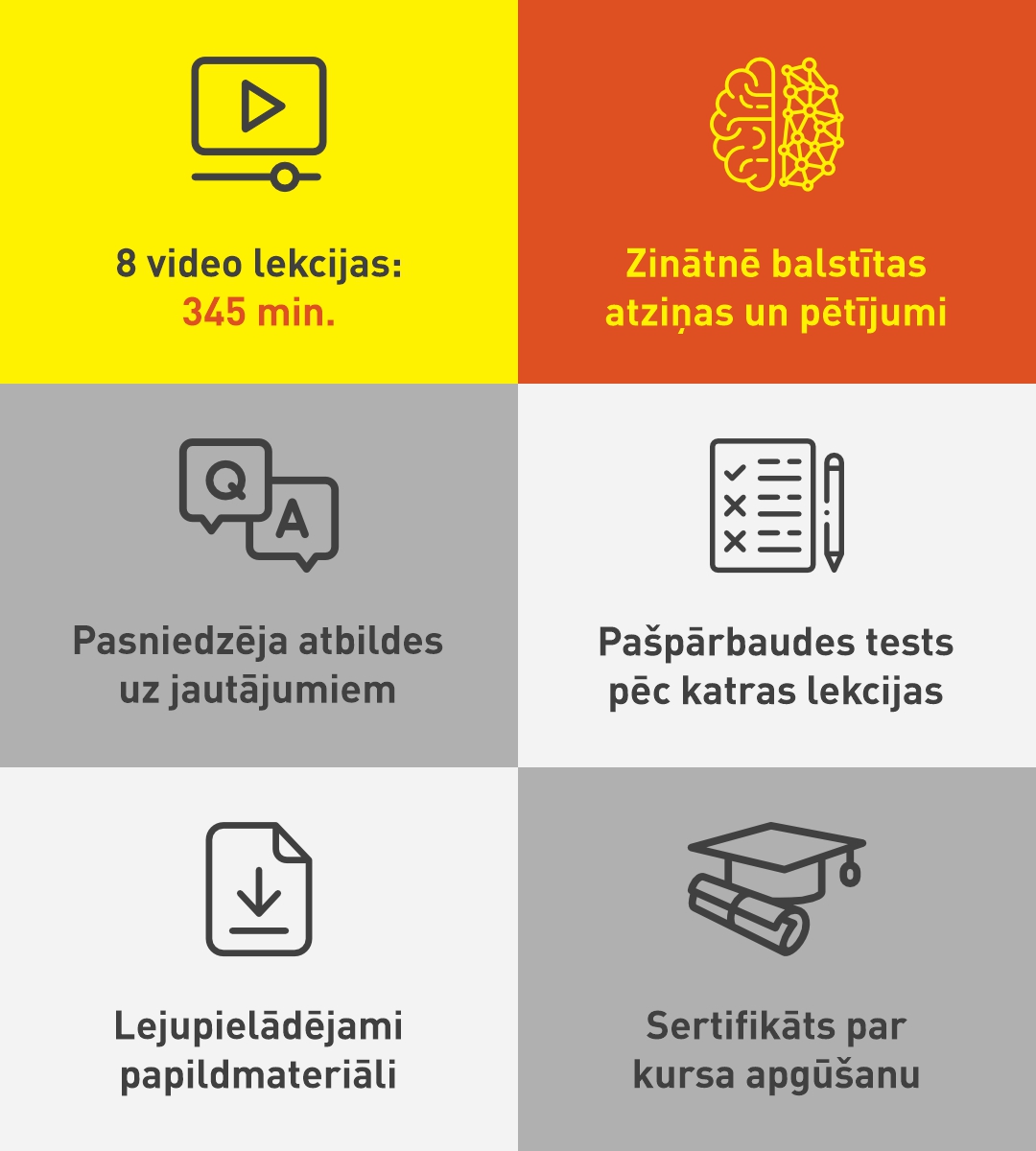 Šajā kursā aplūkosim jaunākos kognitīvās psiholoģijas un neirozinātnes modeļus, kas ļaus labāk saprast, kā darbojas cilvēka prāts. Pētīsim, kā darbojas uzmanība, atmiņa, valoda un uztvere un kur tas redzams ķermeņa neirālajās struktūrās. Ar eksperimentu palīdzību pārliecināsimies, kā visos domāšanas procesos itin viegli ielavās kļūdas. Mēģināsim saprast, kāpēc dažkārt pieņemam kļūdainus, pārsteidzīgus lēmumus un nespējam ātri risināt šķietami vienkāršas problēmas.